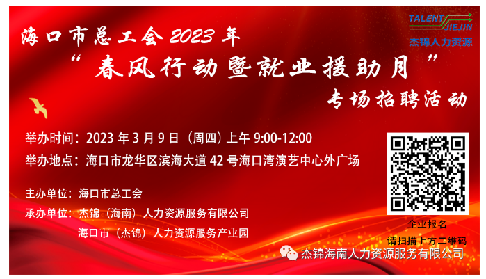 6月24日上午9時(shí)-12時(shí),由海口市龍華區(qū)人力資源和社會(huì)保障局、海口市(龍華)人力資源服務(wù)產(chǎn)業(yè)園主辦,杰...
